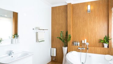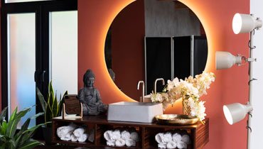 Use light, moisture-resistant materials like porcelain tiles and glass to create a clean, airy feel, Incorporate space-saving storage solutions and modern fixtures to combine style with functionality.